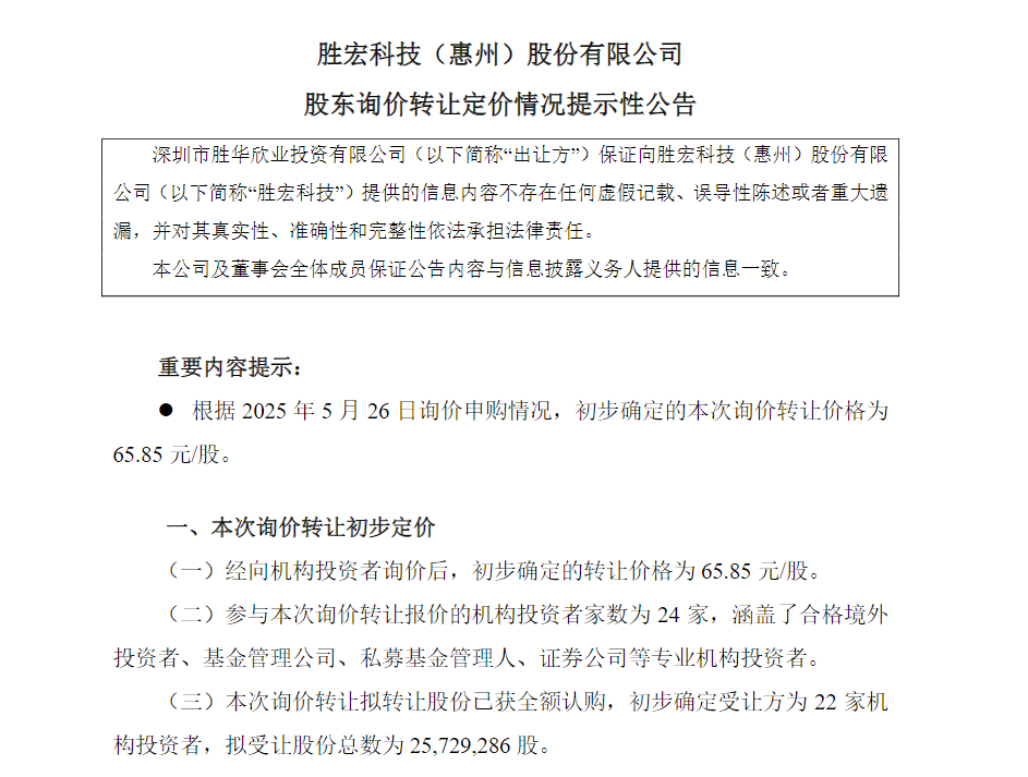 5月26日,印制电路板(PCB)龙头胜宏科技(300476.SZ)披露控股股东深圳市胜华欣业投资有限公司询价转让结果,初步确定转让价格为65.85元/股。这一价格较当日80.2元/股的收盘价折价17.89%。