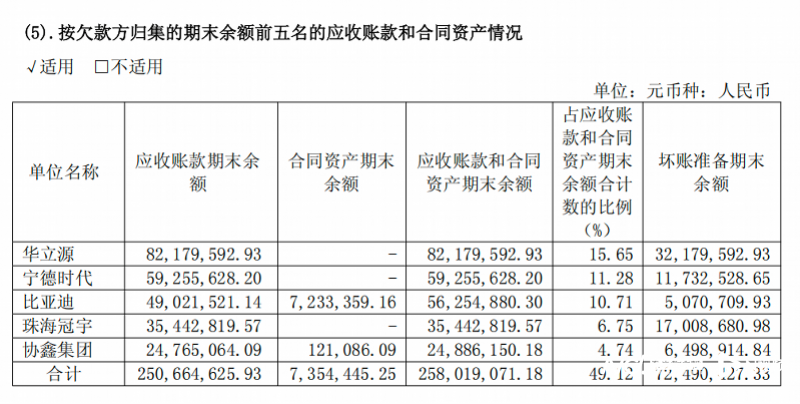 值得一提的是,从年报中可以看到,当前,瀚川智能的欠款方并非仅有宁德时代。财报显示,按欠款方归集的期末余额前五名的应收账款中,宁德时代位列第二,应收账款和合同资产期末余额约为5926万元,占总和的11.28%。欠款最多的是华立源,期末余额约达8218万元,占比15.65%,比亚迪排在第三,期末余额约为5625万元,占比也有10.71%,然后是珠海冠宇和协鑫集团的期期末余额分别约为3544万元和2489万元,占比6.75%和4.74%。