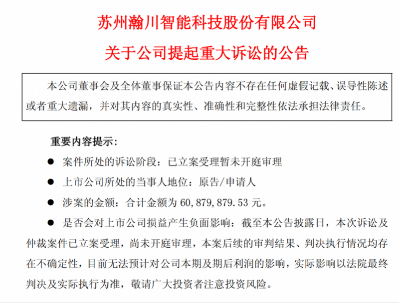 对于前述诉讼,瀚川智能还表示,截至公告披露日,此次诉讼案件已立案受理,尚未开庭审理。而本案后续的审判结果、判决执行情况均存在不确定性,目前无法预计对公司本期及期后利润的影响。