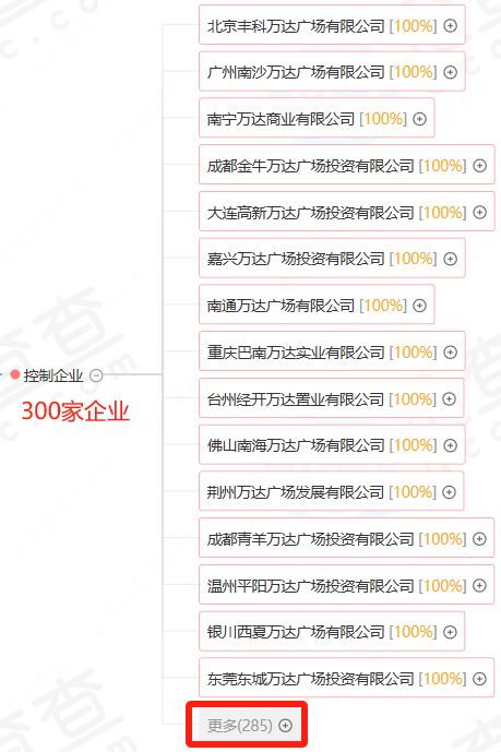 企查查数据显示,大连万达商管目前控制的企业数量为300个,涵盖 各地的万达广场。