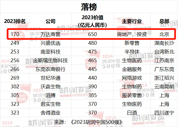 今年年初,胡润公布了中国500强企业,2023年万达商管的价值还有650亿,排在170位。