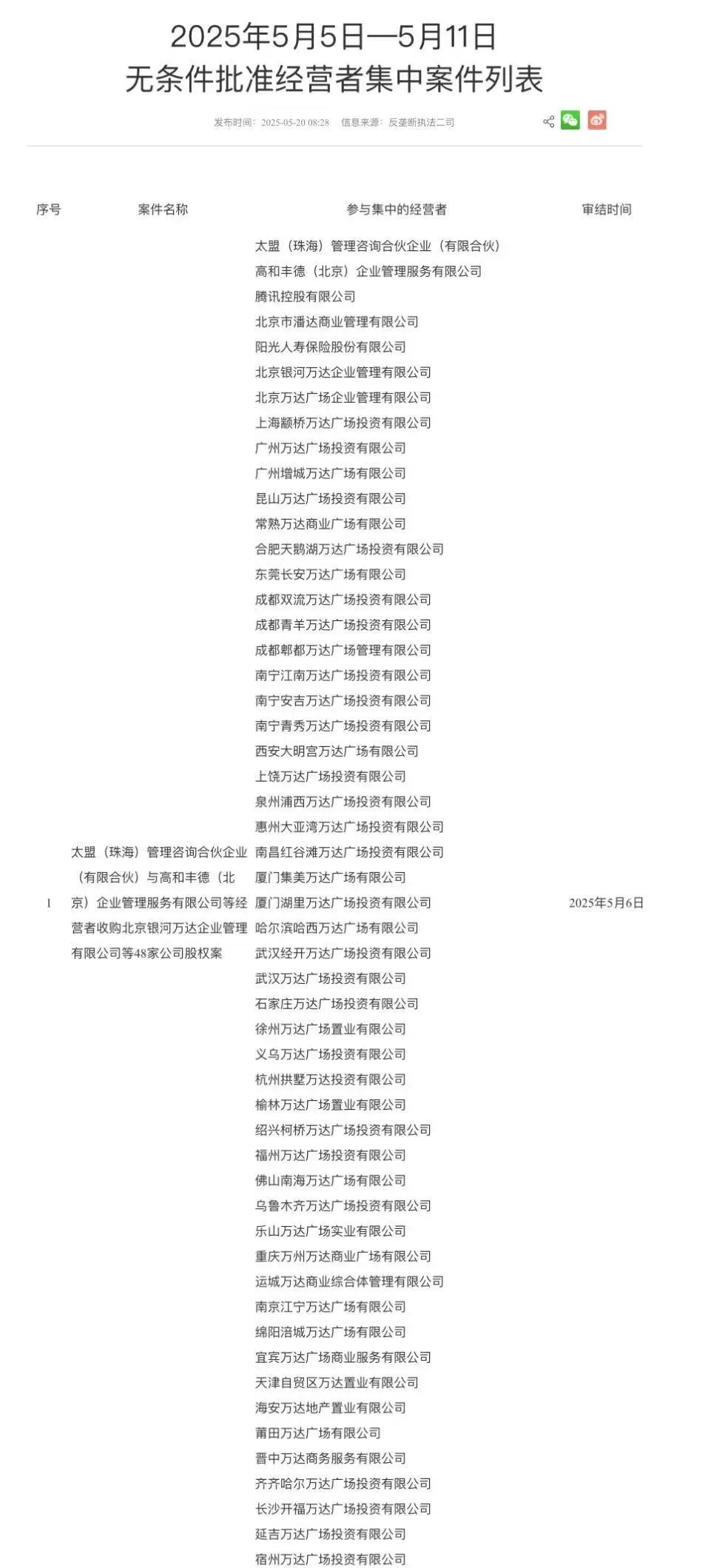 前两天,国家市场 监管总局无条件批准了“太盟等公司收购万达等48家公司股权案”。