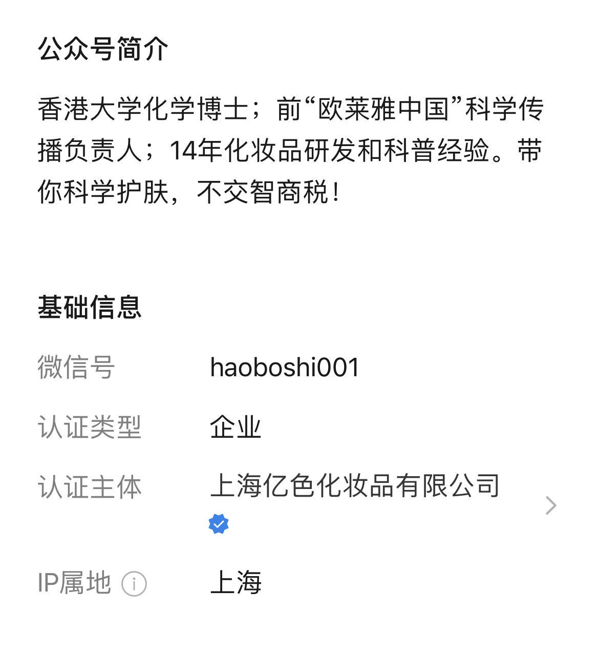“大嘴博士颜究所”公众号显示,郝宇拥有香港大学有机化学博士学位,曾担任过复旦大学化学系老师,在欧莱雅集团做过6年创新配方、7年科学护肤传播。