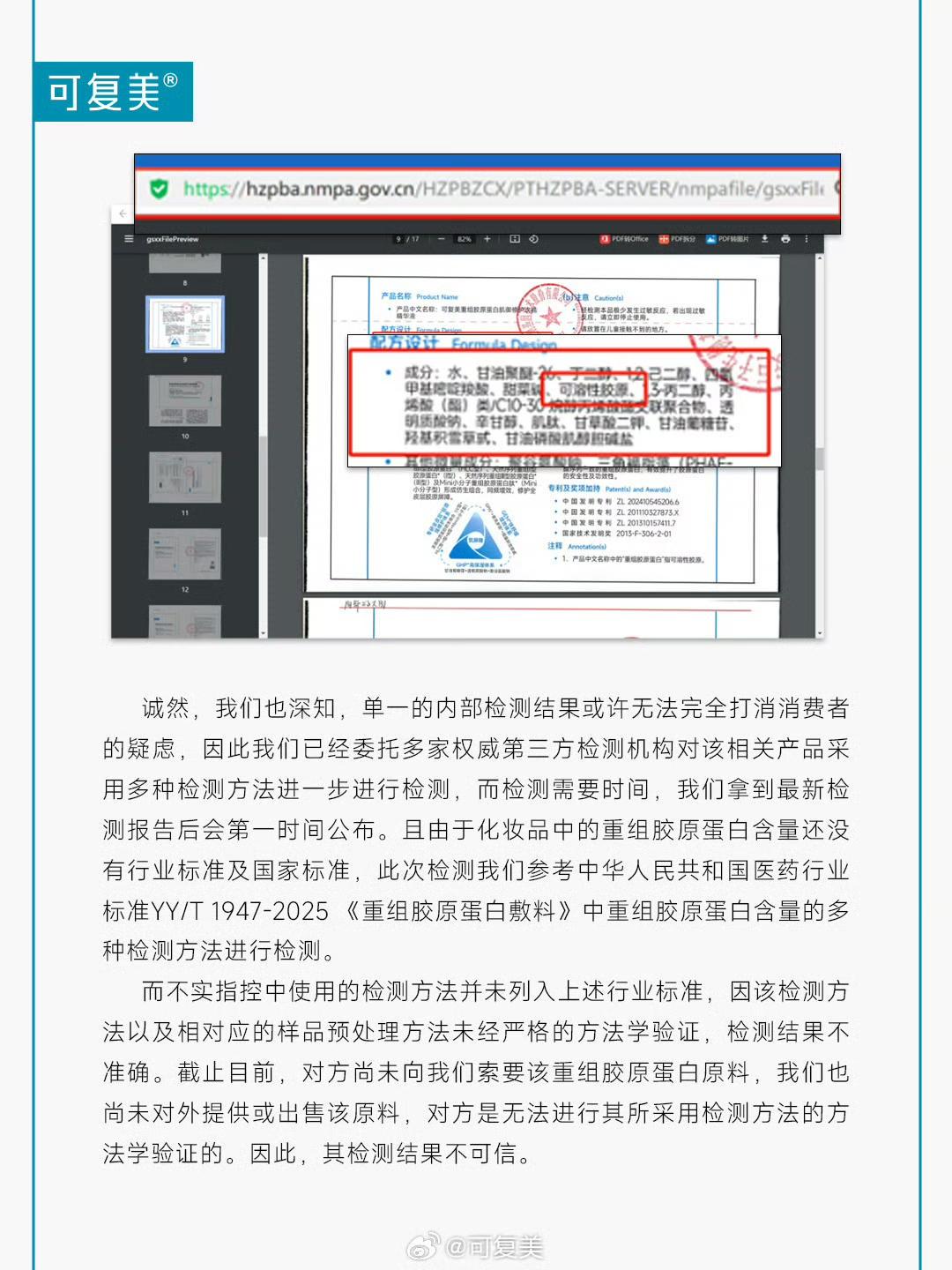 同时,可复美晒出了自己检测的结果:事件发生的第一时间,我们已参考《中华人民共和国药典》及中华人民共和国医药行业标准YY/T 1947-2025 《重组胶原蛋白敷料》中重组胶原蛋白含量的检测方法对相关产品进行检测,多批次检测结果胶原蛋白含量均大于0.1%,与网传的“0.0177%添加量”严重不符。