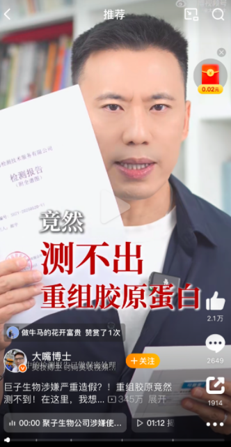5月24日,美妆博主“大嘴博士”郝宇发布视频称,巨子生物旗下的可复美重组胶原蛋白精华涉嫌严重造假,在这款可复美销量最大的产品中,重组胶原蛋白真实添加量仅为0.0177%。