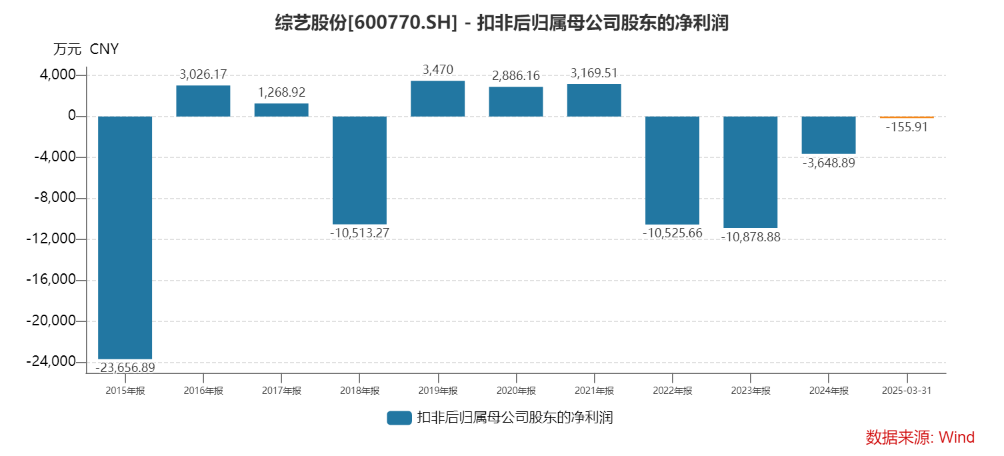 时代周报记者注意到,2022年至2024年,综艺股份扣非净利润分别为-1.05亿元、-1.09亿元以及-3648.89万元,已连续三年亏损。