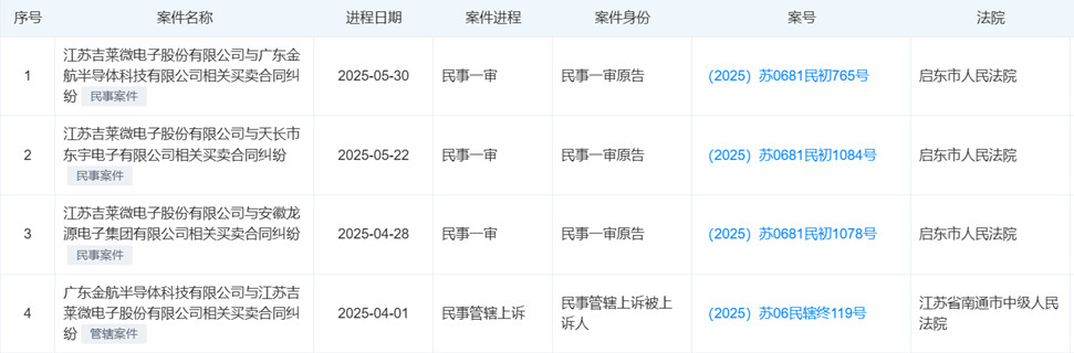 天眼查显示,2025年1月8日,吉莱微因买卖合同纠纷起诉金航半导体获立案。1月15日,吉莱微申请对金航半导体财产保全执行案件获立案。有关买卖合同纠纷之诉,该案将于5月30日一审开庭审理。