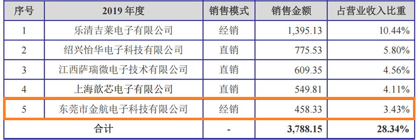 2019年,广东金航半导体科技有限公司(以下简称“金航半导体”)曾是吉莱微前五大客户之一,与公司的年销售金额为458.33万元,占公司年营收的3.43%。
