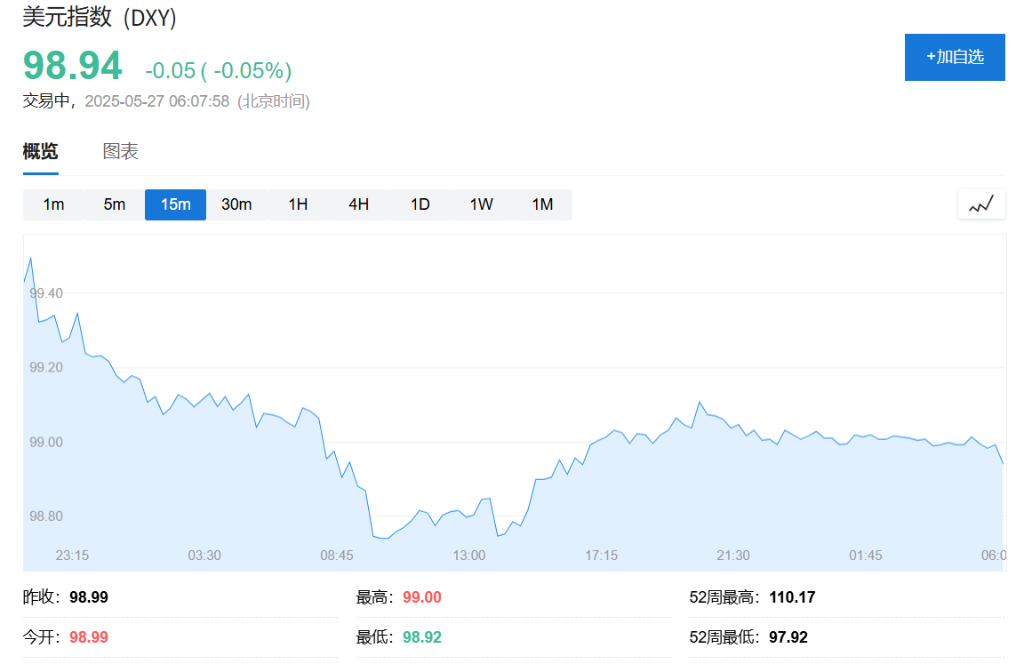 纽约尾盘,ICE美元指数跌0.11%,报99.006点,全天处于下跌状态。