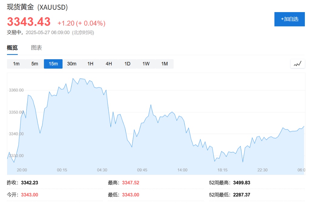 纽约尾盘,现货黄金下跌0.41%,报3343.84美元/盎司,全天处于下跌状态,北京时间17:26刷新日低至3323.83美元。