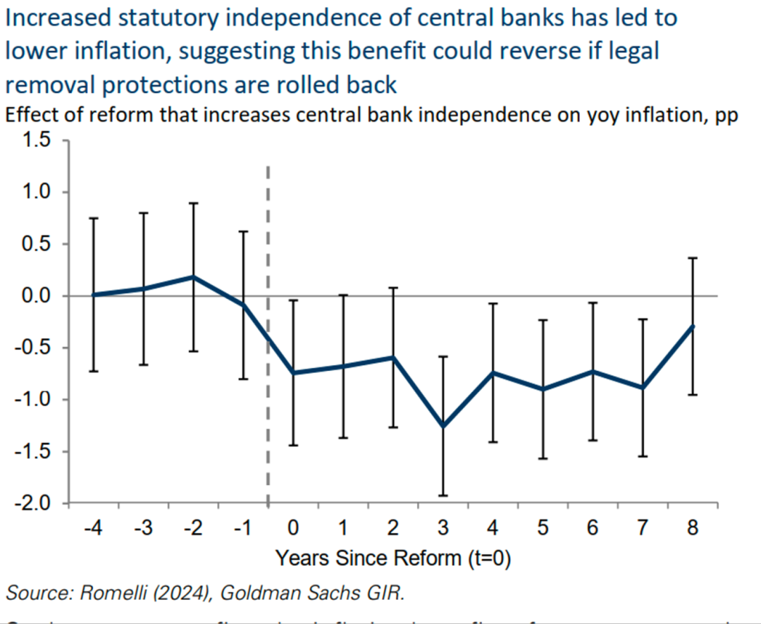 5.高盛研究指出,提升央行法定独立性,尤其是强化央行官员免职保护,能显著降低通胀。历史数据显示,在此类改革后8年内,平均每年通胀降幅在0.5至1个百分点。当前G20大多数央行官员享有类似于美联储现行“因故罢免”条款的保护,若美国修改相关法律,削弱对美联储官员的任期保障,将使美联储在主要经济体中处于例外地位。高盛警告,若美联储被赋予“随意罢免”机制,可能削弱市场对其独立性的信心,进而推高通胀预期并削弱政策效果。