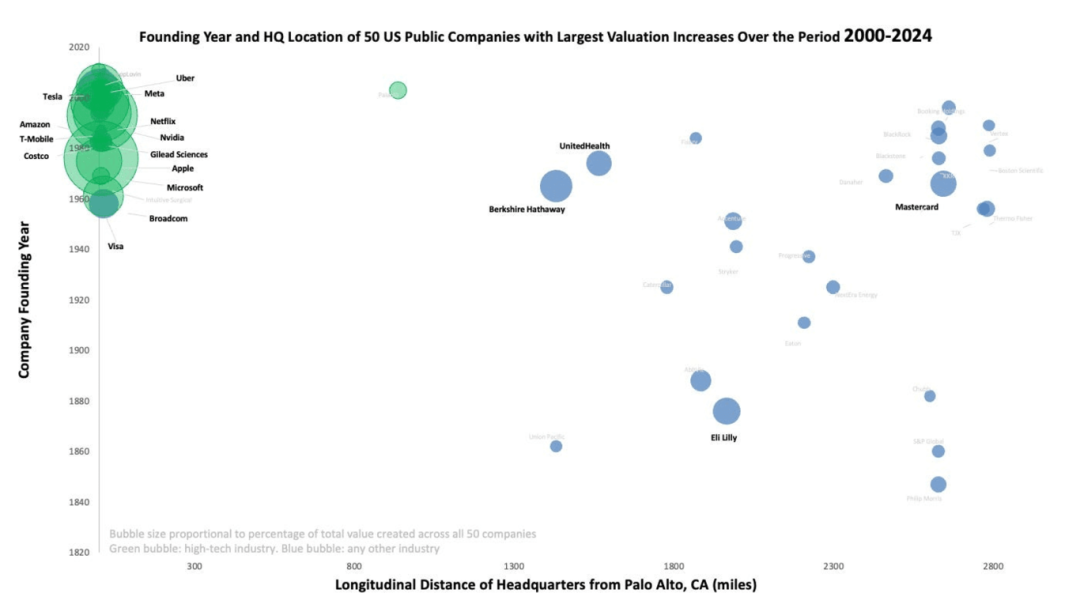 3.2000年至2024年间,美国市值增长的重心显著向西海岸集中,前50家最大的上市公司中,有70%的市值增长来自于西海岸的公司。苹果、微软、亚马逊、Meta、英伟达等巨头均集聚于这一区域。