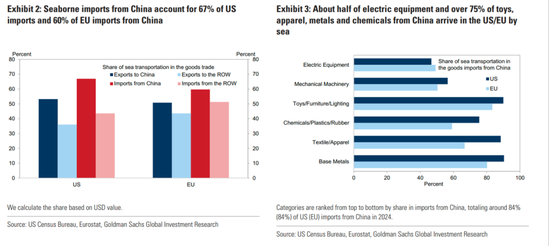4.2025年第一季度,美国自中国进口中有69%通过海运完成,高于2017年的62%;欧盟这一比例则为60%。相比之下,美国和欧盟自全球其他地区的海运进口占比分别仅为44%和51%。除高价值电子设备等商品倾向空运外,如玩具、家具、金属制品和化工品等中低价值商品多经海运。大宗商品因体积和单价原因也主要走海运。近年来电子产品逐步转向海运,如苹果以减少碳排为由,已将更多智能手机和平板通过海运运输。