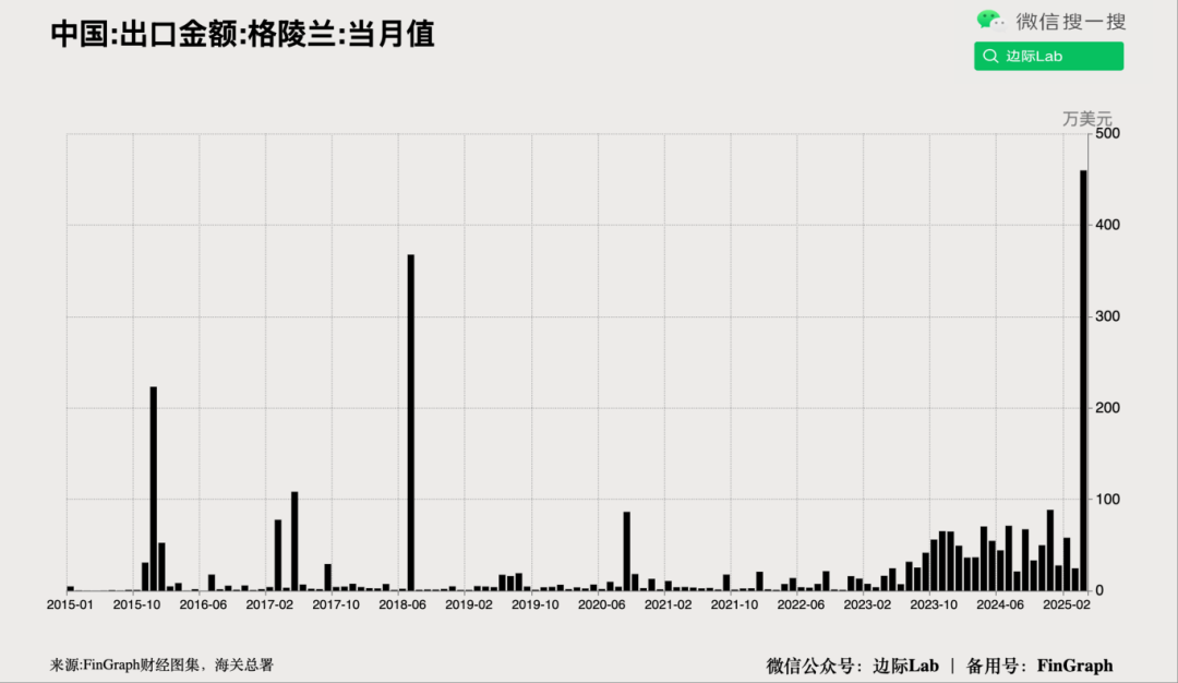 5.在特朗普多次表达控制格陵兰岛意图的背景下,2025年4月中国对格陵兰岛的出口突然飙升至近500万美元,较此前月均不到50万美元的水平异常激增。