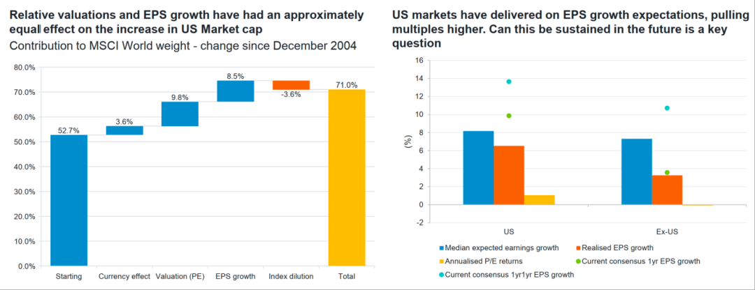 1.自2004年12月以来,美国市场在MSCI全球指数中的权重上升了18.3个百分点,这一增长主要由盈利增长(+8.5个百分点)和估值扩张(+9.8个百分点)共同驱动。美元走强也带来3.6个百分点的正面效应,而成分股摊薄则略有负面影响(-3.6个百分点)。但是,当前美股一致预期的EPS增长已降至个位数,是否还能支撑高估值成为关键问题。