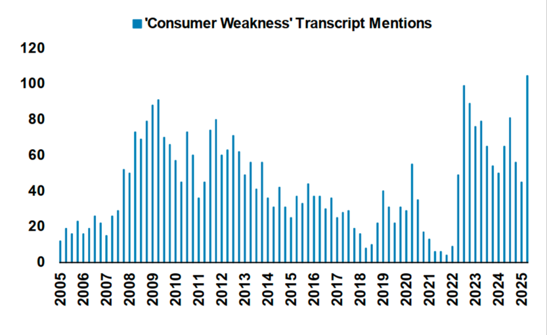 4.美国上市企业财报会议中,对“消费者疲软”(Consumer Weakness)的提及频次在2025年再度上升,创下至少二十年来的新高,表明市场对消费者支出前景的担忧加剧。