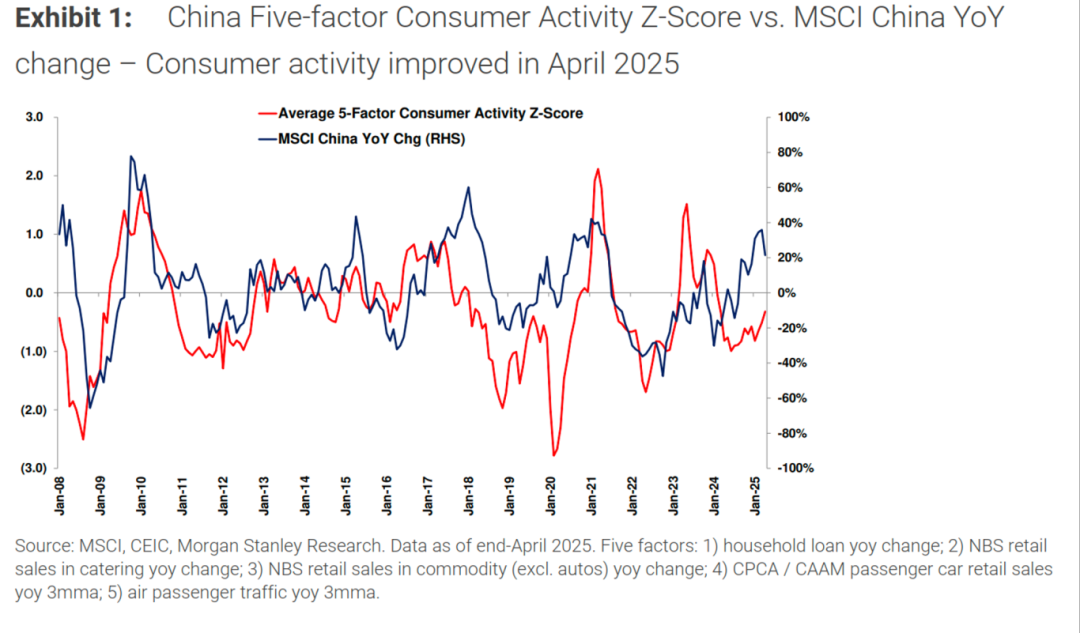1.摩根士丹利发布的报告显示,其专有的中国消费者活动五因素Z分数在2025年4月有所改善,但仍处负值区间,显示消费动能复苏不稳。家庭贷款、乘用车零售和航空出行有所回升,餐饮零售持平,商品零售受关税因素拖累转弱。该Z分数与MSCI中国指数历史相关性高,当前反弹或阶段性利好市场表现。但摩根士丹利指出,以旧换新政策效应递减、财政刺激有限且落地延迟,三季度或将再次压制消费回暖,Z分数大概率难以持续上行。