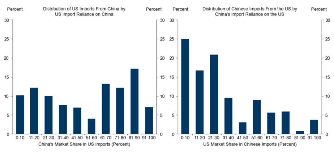 2.美国对中国的进口依赖显著高于中国对美国的依赖。在美国进口自中国的产品中,超过40%的品类中,中国的市场份额占比高达60%以上;而在中国进口自美国的品类中,逾60%的产品类别中,美国的市场份额低于30%。