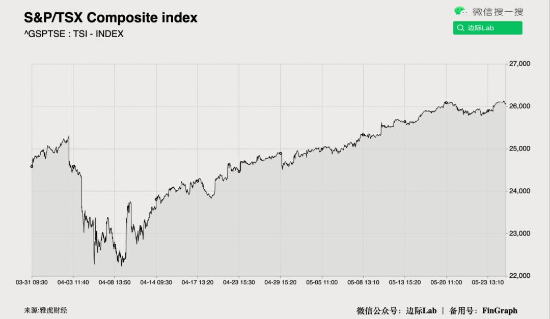 受特朗普将欧盟进口商品加征50%关税的计划推迟至7月9日提振,投资者对贸易谈判前景更趋乐观,加拿大S&P/TSX综合指数周一上涨0.75%,收于历史新高的26073点。科技板块领涨,其次是工业和能源板块(尽管油价变化不大)。个股方面,ATS Corporation大涨逾20%,Brookfield和Shopify分别上涨2.3%和2.7%;Ivanhoe Mines因刚果地震暂停运营,股价下跌近16%。