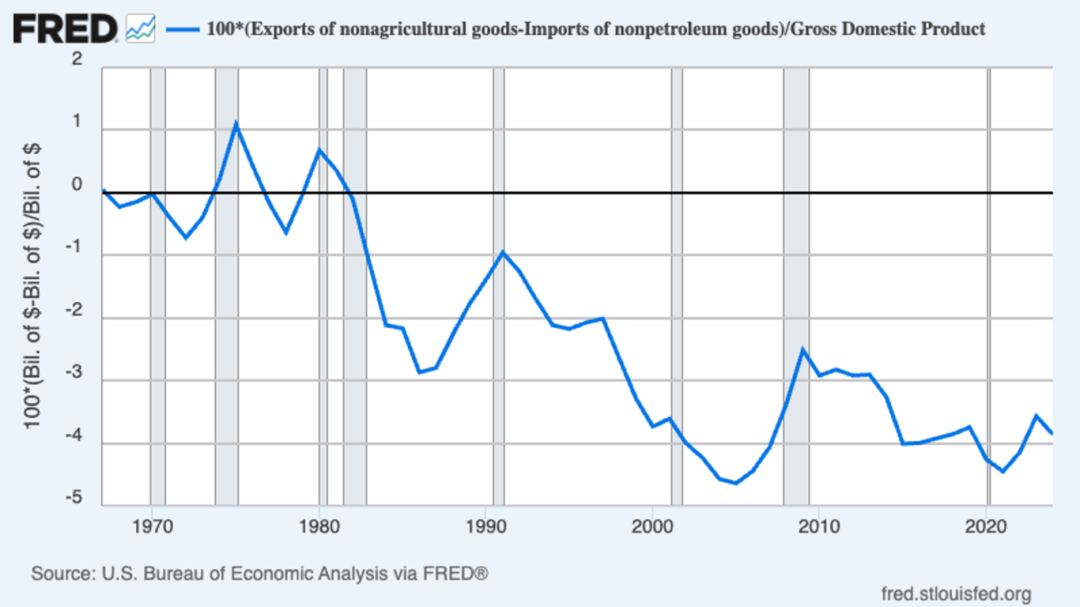 2.诺贝尔经济学奖获得者保罗·克鲁格曼指出,美国制造业占GDP比重已从高峰下降约15个百分点,但同期贸易逆差仅扩大约4个百分点,显示“去工业化”主要原因并非贸易赤字。即便消除制造业贸易逆差,考虑到制造业每一美元支出中仅约63美分为本部门实际增加值,最终对GDP的净贡献仅约2.5个百分点,只能将制造业比重从当前约10%提升至12.5%,远低于“黄金时代”的25%,反映结构性转型远非贸易所能逆转。