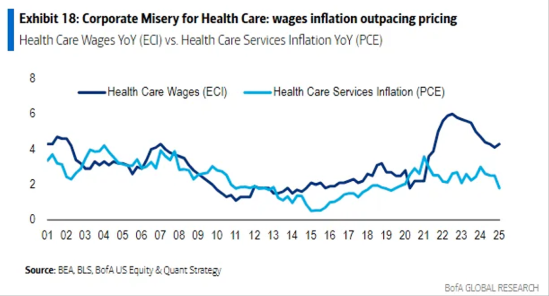 6.自2021年起,美国医疗保健行业的工资增速持续快于医疗服务价格通胀。由于人工支出是医院、家庭护理及临终关怀机构的最大成本项,工资上涨快于提价能力将持续压缩利润率,构成该行业盈利能力的关键下行风险。