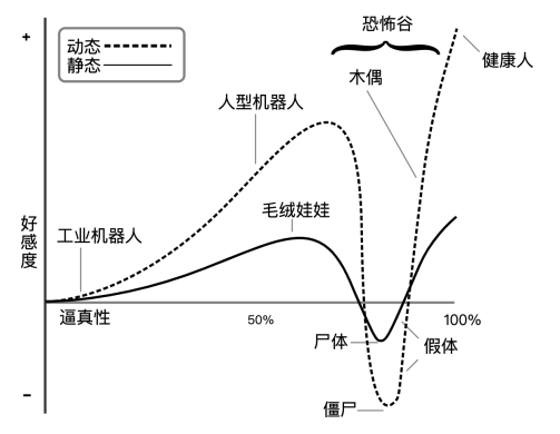1970年,日本机器人专家森政弘提出“恐怖谷效应”——人们对物体的好感度会随其与人类的相似度提升而增加,但当相似度达到一定程度又未完全逼真时,好感度会急剧下降,直至与人类完全相似(或本身为真人)时,好感度才会回升。