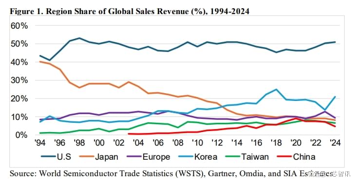 ▲过去30年来,美国半导体营收占全球比重最高,2024年逾5成。(来源:SIA)