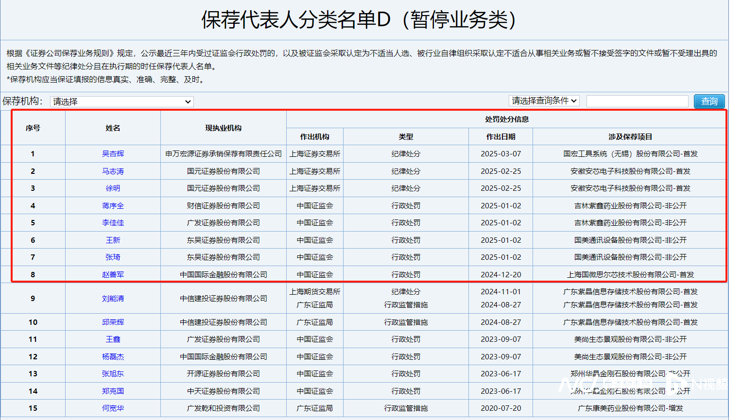 日前,中国证券业协会(以下简称“中证协”)在官网更新了一批保荐代表人D类(暂停业务类)名单,涉及8名保荐代表人、6家券商。