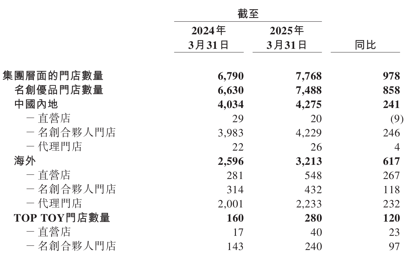 截至2025年3月31日,名创优品集团层面的门店总数为7768家,同比净新开978家门店。其中,位于中国内地的名创优品门店数为4275家,同比净新增241家,其直营门店数量下降至20家;位于海外的名创优品门店数为3213家,同比净新增617家。在美国市场,名创优品目前总门店数已超300家。