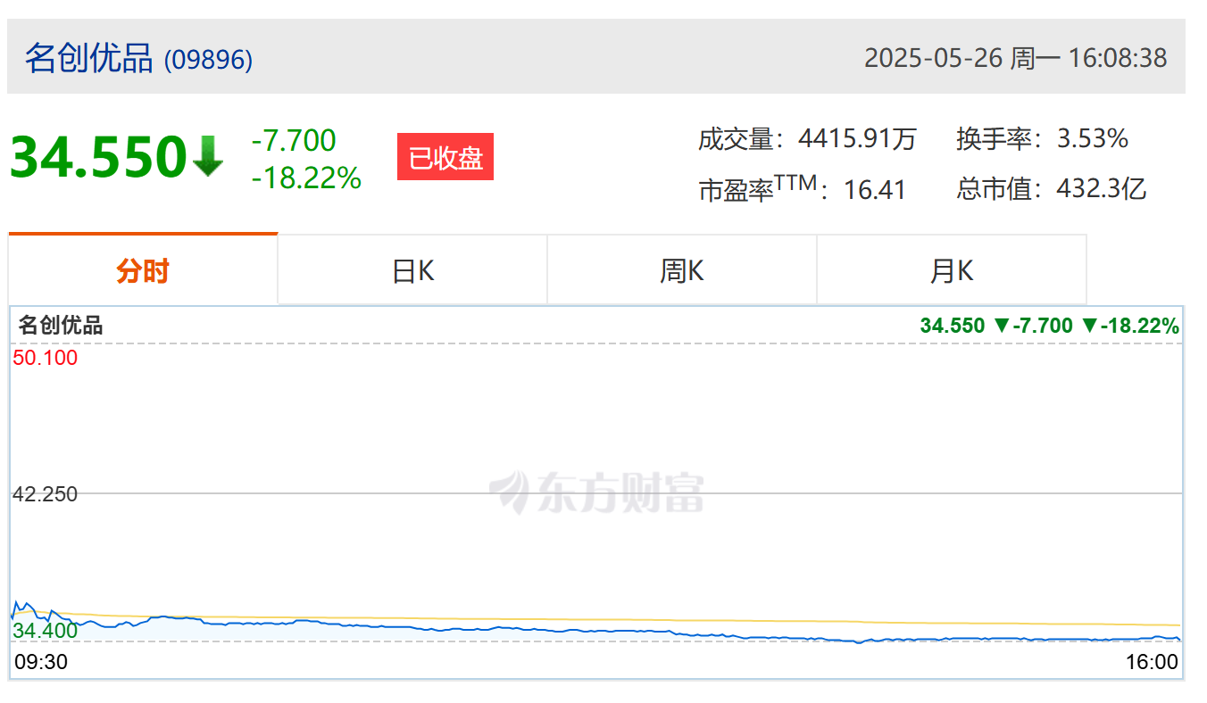 最新财报发布后,名创优品美股、港股股价双双下跌。截至5月26日收盘,港股股价跌幅达18.22%,每股报34.55港元,总市值缩水至432.3亿港元,其美股报18.29美元,跌17.58%,总市值约57.22亿美元。