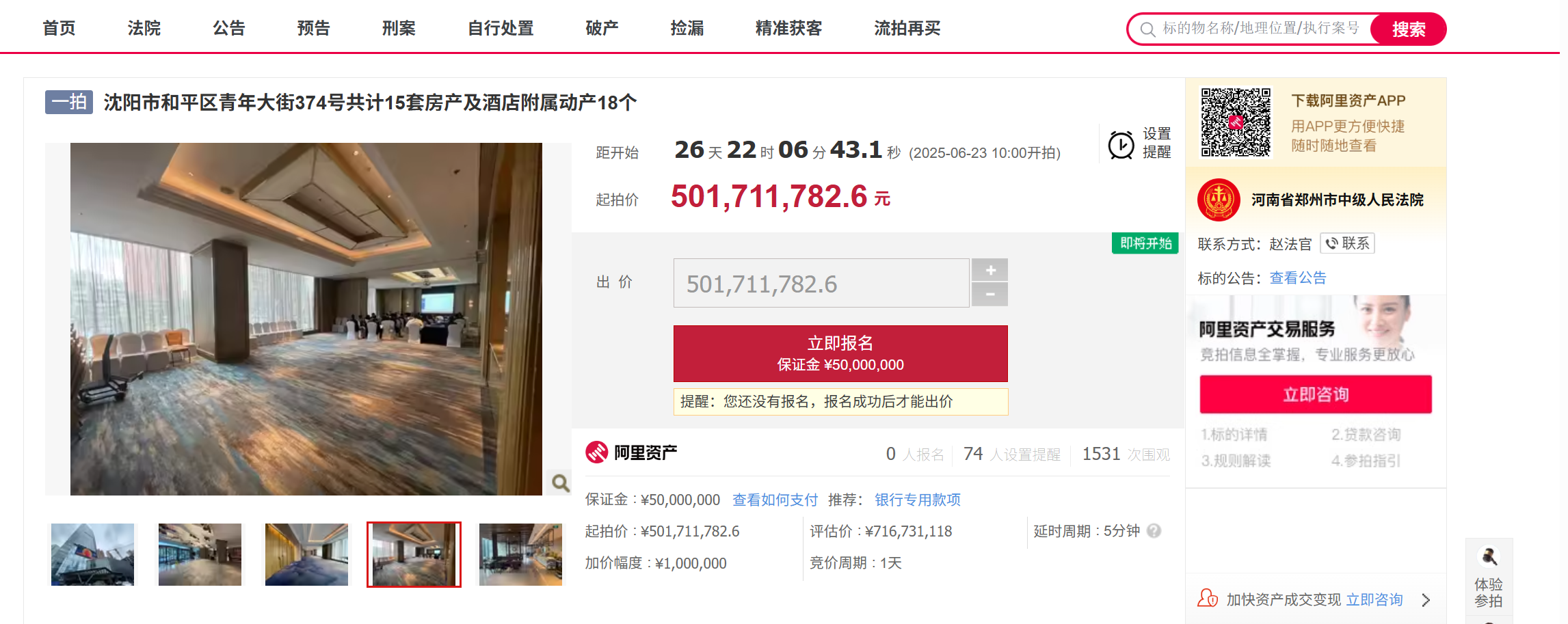 红星资本局5月27日消息,阿里资产拍卖平台显示,沈阳市和平区青年大街374号共计15套房产及酒店附属动产18个资产将被拍卖,该资产评估价为7.17亿元,起拍价为5.01亿元。据悉,标的所在地是青年大街地标“沈阳世茂希尔顿酒店”。截至发稿,此次拍卖共吸引74人设置提醒,超1500次围观。