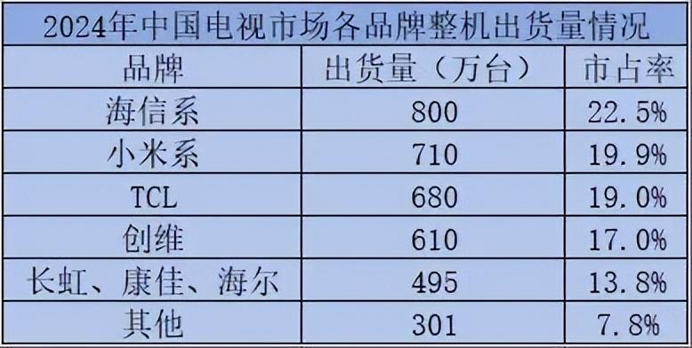 此外,长虹、康佳、海尔三大品牌2024年出货总量约495万台,合并市占率13.8%。