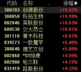 创源股份、科拓生物20%涨停,英联股份、交大昂立涨停,瑞普生物、哈三联等跟涨。
