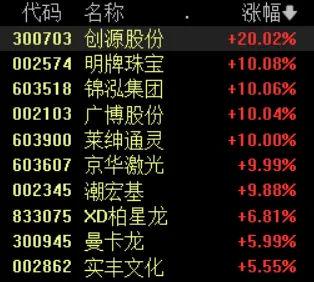 京华激光再度涨停,连收获四连板;创源股份20%涨停,明牌珠宝、莱绅通灵、广博股份等涨停,潮宏基、金运激光等跟涨。