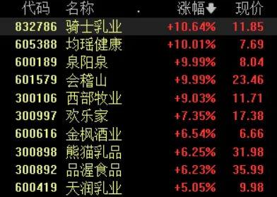 食品加工制造、乳业、白酒方向涨幅居前,交大昂立、会稽山、泉阳泉、均瑶健康涨停,骑士乳业、欢乐家、西部牧业、有友食品等跟涨。