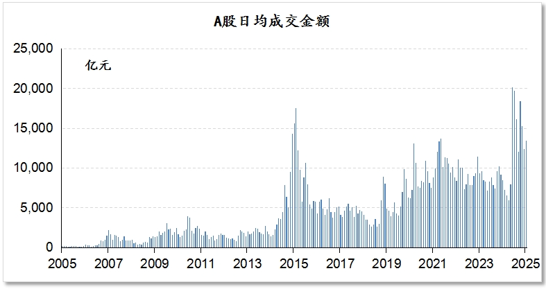 当下国内股票市场交易活性有待激发。在经历了去年四季度“政策组合拳”红利过后,国内资本市场近期似乎投资热度有所降温。2025年以来,国内三地交易所日均成交金额为1.43万亿元,较2024年四季度成交水平缩水23%。近期来看,投资者对外部环境、上市公司经营状况、以及后续是否存在进一步稳定股市政策等不确定性感到忧虑。