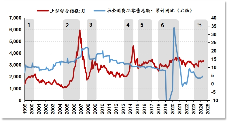 综上可见,当前和未来一个时期,通过房产和理财两种投资方式来提升居民财产性收入的空间十分有限,甚至还会继续收缩。与此不同的是,作为财产性收入的重要来源,在更加积极的财政政策和适度宽松的货币政策的框架下,完善资本市场的繁荣和发展将有助于提振社会各类经济主体的信心,增加投资者的财产性收入,对促进消费起到重要的积极作用。回顾历史上六个阶段股市上涨对消费的影响,或许有助于更好把握两者之间的关系。