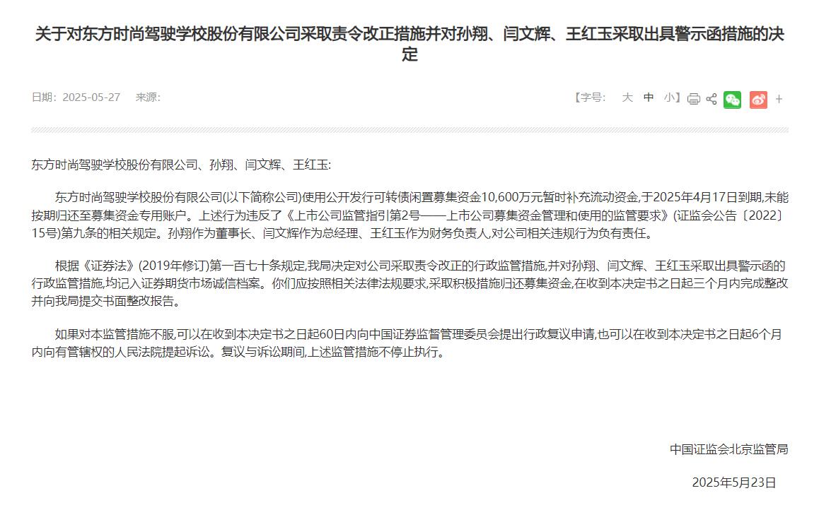 北京证监局指出,ST东时使用公开发行可转债闲置募集资金1.06亿元暂时补充流动资金,于2025年4月17日到期,未能按期归还至募集资金专用账户。上述行为违反了《上市公司监管指引第2号——上市公司募集资金管理和使用的监管要求》(证监会公告〔2022〕15号)第九条的相关规定。孙翔作为董事长、闫文辉作为总经理、王红玉作为财务负责人,对公司相关违规行为负有责任。