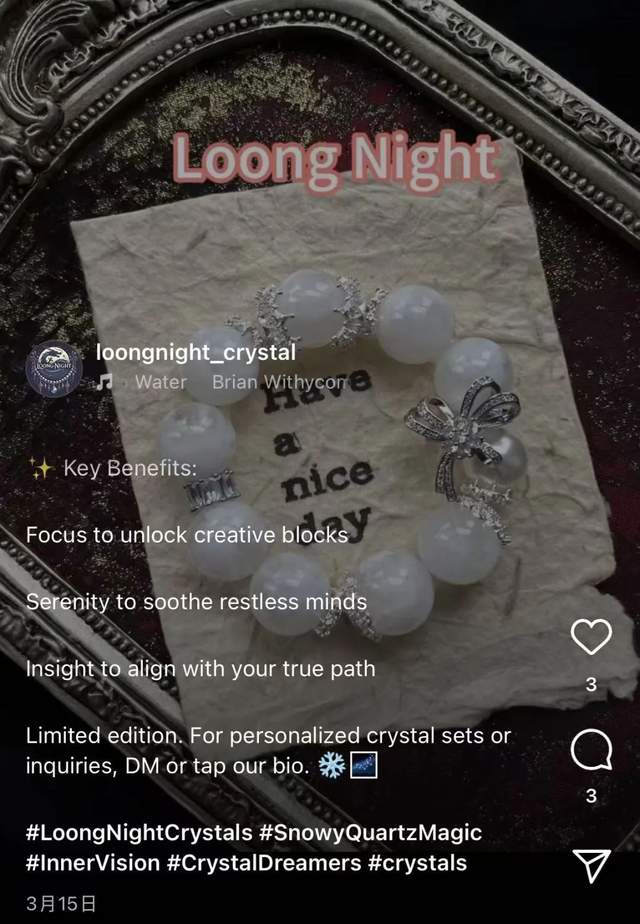 和中国人的购物习惯不同,在国外,人们更喜欢在品牌自己的网站下单,而非购物平台。因此,如果在小红书上搜索“跨境卖水晶”,跳出来的帖子大多数都是教人如何建立品牌的独立网站。海外社交媒体的营销也必不可少。宋宇很快建立了自己的账号,把logo设计成了东方龙的形象,宣传语是:“用东方古老的耳语唤醒你的内心力量。”再配上平安扣、竹叶背景……每一种中国元素的叠加,都在为水晶销往国外的定价“添砖加瓦”。