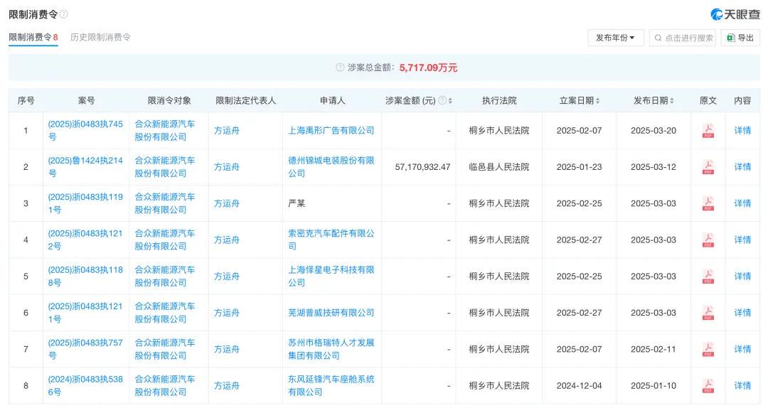据天眼查显示,合众新能源汽车股份有限公司现存开庭公告327条,基本都是来自哪吒汽车的零部件供应商以及广告营销公司,现存8则限制消费令,限制对象均为董事长方运舟,涉案总金额5717.09万元,累计95次被执行,被执行总金额14499.27万元,累计出现95条被法院冻结股权的记录。