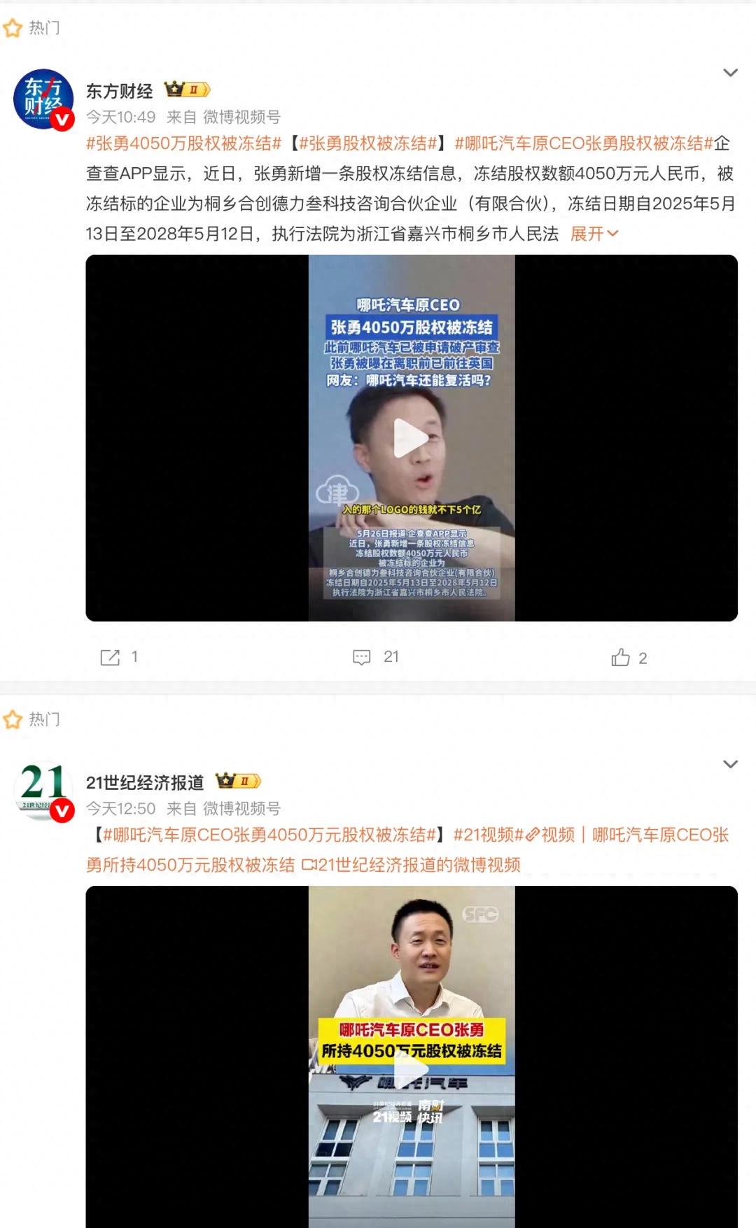 据天眼查显示,哪吒汽车原CEO张勇新增一条股权冻结信息,冻结股权数额4050万元人民币,被冻结标的企业为桐乡合创德力叁科技咨询合伙企业(有限合伙),冻结日期自2025年5月13日至2028年5月12日,执行法院为浙江省嘉兴市桐乡市人民法院。