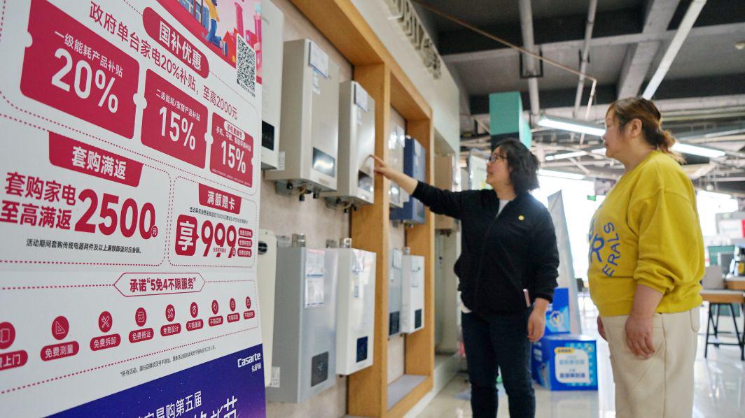图为在浙江省嘉兴市一家大型家电商场,工作人员正在向消费者介绍一款参与政府补贴活动的热水器。(图片由CNSPHOTO提供)