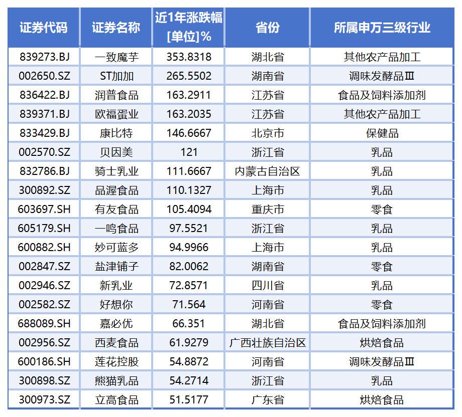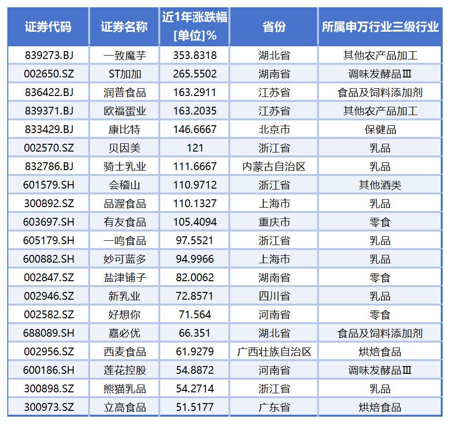 其中,一致魔芋、ST加加、润普食品、欧福蛋业、康比特、贝因美、骑士乳业、品渥食品、有友食品9只个股涨幅超过100%。一致魔芋表现尤为亮眼。