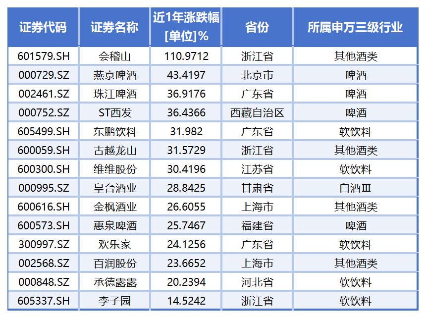 截至5月27日收盘,A股饮料制造板块共计45只个股。近一年来,涨幅超过10%的有14只个股。其中,会稽山表现尤为亮眼。