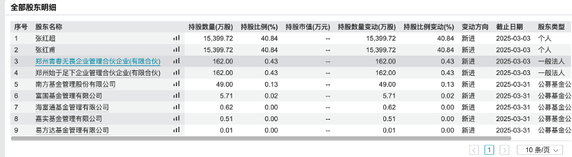 在全球拥有4万多家门店的“雪王”蜜雪集团,实际控制人为张红超、张红甫,二人来自河南,系亲兄弟。根据最新财报,2025年一季度末,张红超、张红甫目前合计持有蜜雪集团约3.08亿股,持股比例约为82%。此外,员工持股平台郑州青春无畏企业管理合伙企业(有限合伙)、郑州始于足下企业管理合伙企业(有限合伙)分别持有162万股、162万股公司股份,持股比例分别为0.43%、0.43%。考虑到还有机构投资者持股,实际在市场中流通的股票并不多。