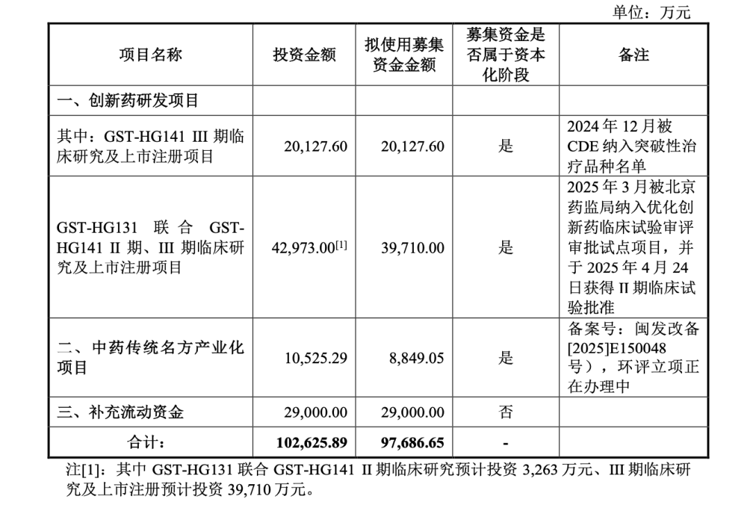 其中,拟使用募集资金5.98亿元用于创新药研发项目,该项目投资金额为6.31亿元;拟使用募集资金8849.05万元用于中药传统名方产业化项目,该项目投资金额为1.05亿元;拟使用募集资金2.9亿元用于补充流动资金。