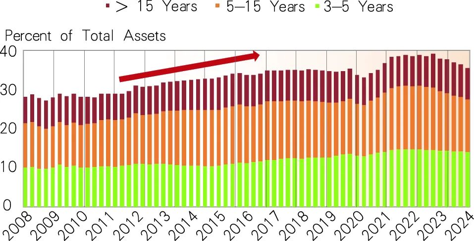 拉长久期,锁定长期收益。低利率不等于息差下降,但受金融让利、同业竞争加剧、存款利率相对刚性等因素的影响,低利率往往伴随着息差下降(见图4)。为此,商业银行往往在保障流动性的基础上,通过拉长贷款期限以减缓息差收窄的压力。回顾历史,低利率周期中,日本银行业贷款期限普遍延长,美国银行业同样呈现资产久期拉长趋势,2008年至2024年,期限超3年的信贷及证券资产占比从28.5%跃升至35.2%,其中5—15年、15年以上的资产占比分别抬升1.5%与4%,彰显其应对利率变化、优化资产结构的长期资产布局(见图5)。
