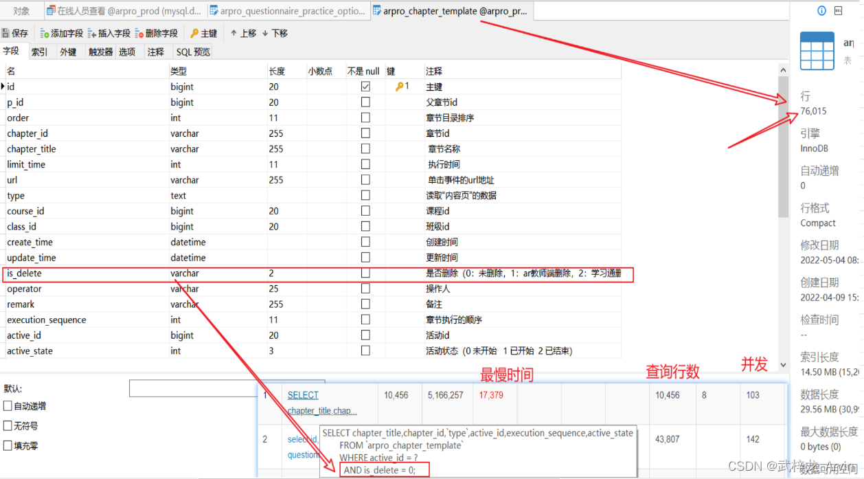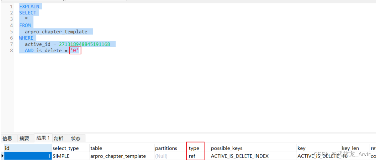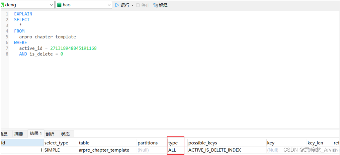 type中的ALL代表全表查询,用结果上来看我们添加的索引是没有生效的。因为我们在执行sql语句的时候is_delete赋的值是数值类型,但是数据库中是字符类型。所以进行了类型的转换。导致索引是没有生效的。