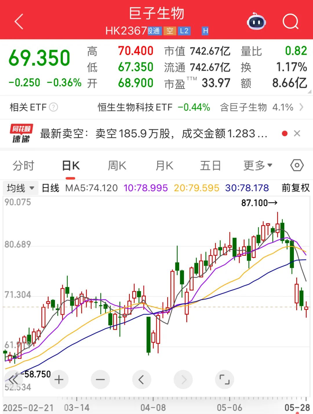 5月27日,素有“重组胶原蛋白第一股”之称的巨子生物以72.35港元的价格低开,随后一路走低,最终以69.6港元的价格收盘,收跌5.43%。28日,巨子生物继续以微跌收盘,算上前两个交易日,巨子生物股价三日累计下挫9.58%,市值蒸发约79亿港元。