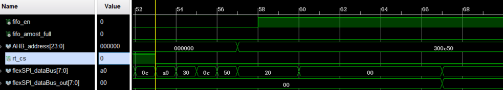 我的应用是将代码放在SPI Flash中存储,通过修改分散加载文件和拷贝中断向量表的方式,启动后将代码搬移到SDRAM中,再重新配置FlexSPI接口,然后通过AHB方式开始访问FPGA,FPGA通过FIFO的方式将数据进行输出,由于我的应用中通过地址区分需要发送的数据,因此地址字段(下图中0x30,0x0C,0x50)不能省去,只用到地址的最高4位,后面的数据用来实现FIFO连续输出。数据长度字段(0x20)用于通知FPGA输出多少个数据。如果不开启Cache功能,每次只能传输4字节(uint32_t)或8字节(uint64_t),下图是开启了缓冲功能后的时序图,每次可以传输32字节(与AHB RX buffer 缓冲区设置大小有关)。